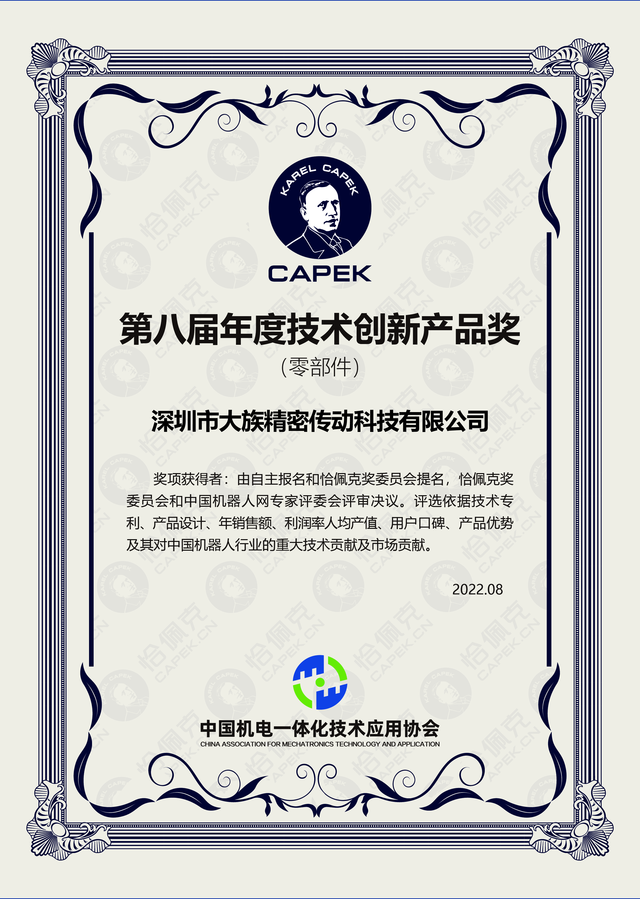 大族谐波传动作为国内专注于精密谐波减速器研发生产的企业,凭借自主研发和创新概 念,产品技术获得重大突破,荣获恰佩克“第八届年度技术创新产品奖”。